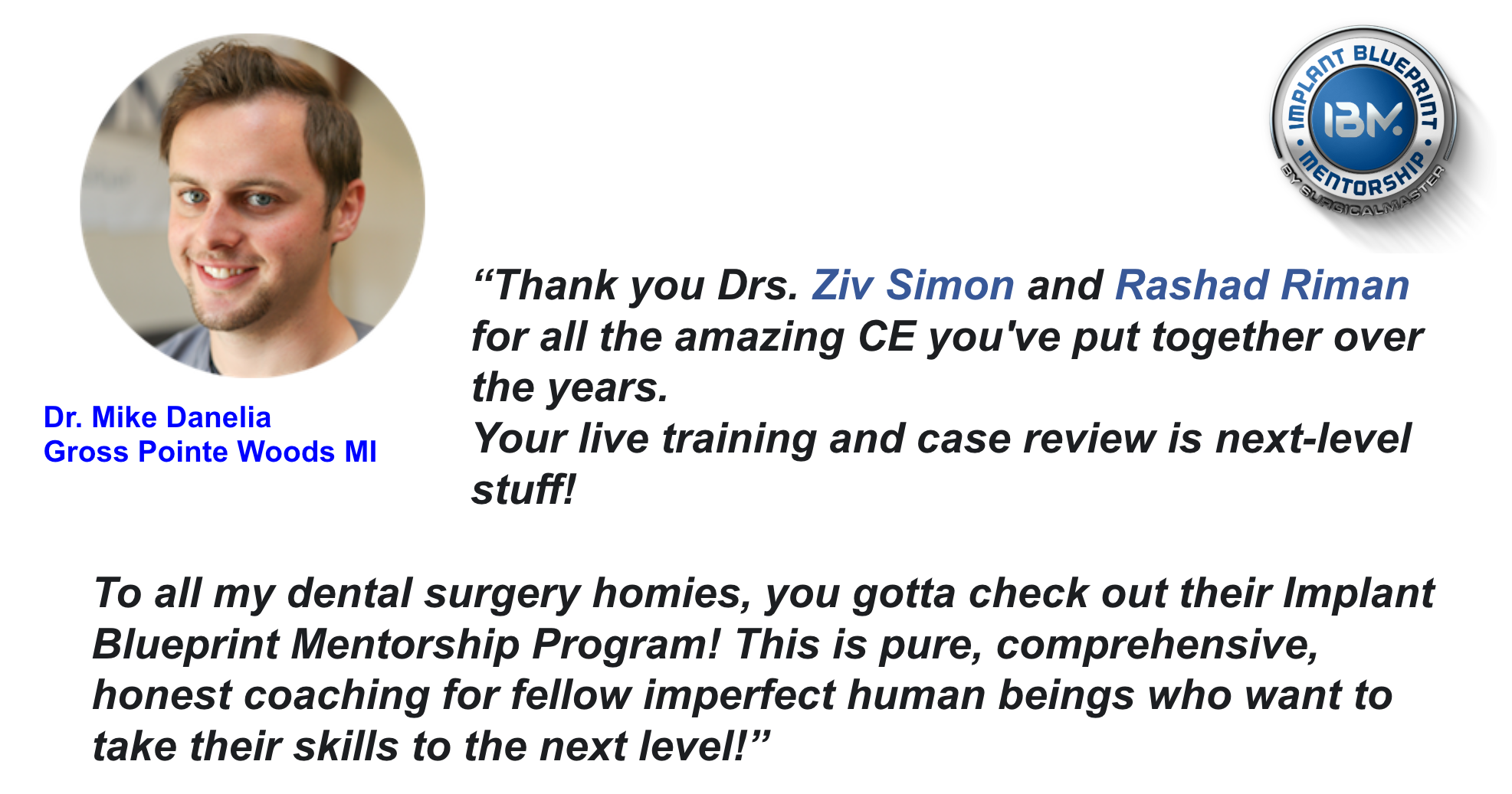 Join hundreds of dentists that are getting mentored on implant surgery, extractions, bone, and tissue grafting surgeries. These dentists are fast-tracking their growth in implant dentistry by implementing the clear and easy to do blueprints inside the IBM Program.